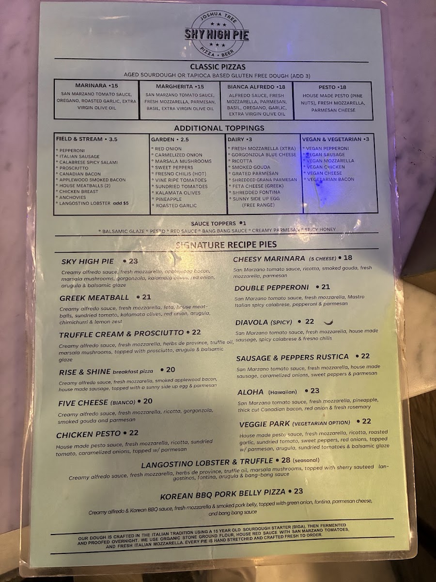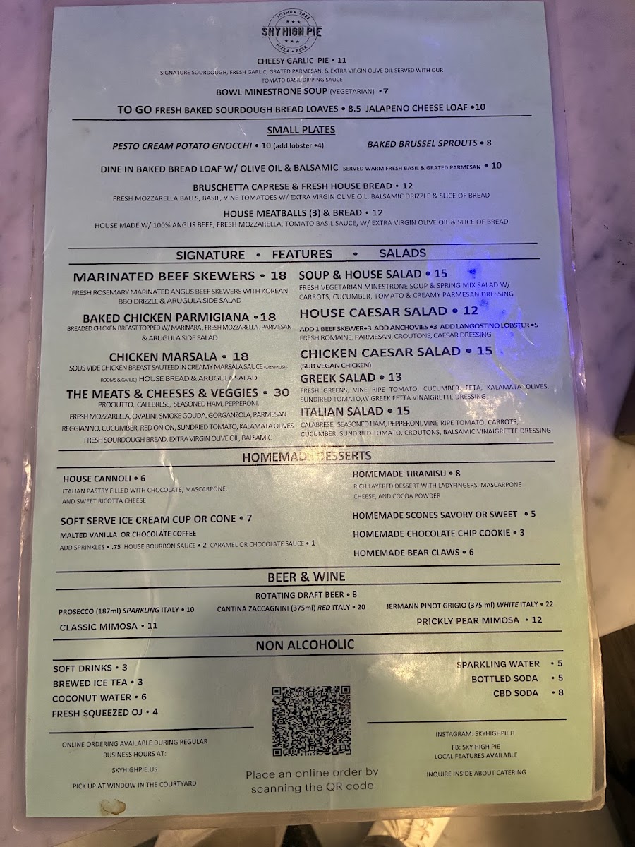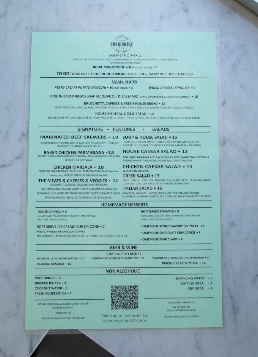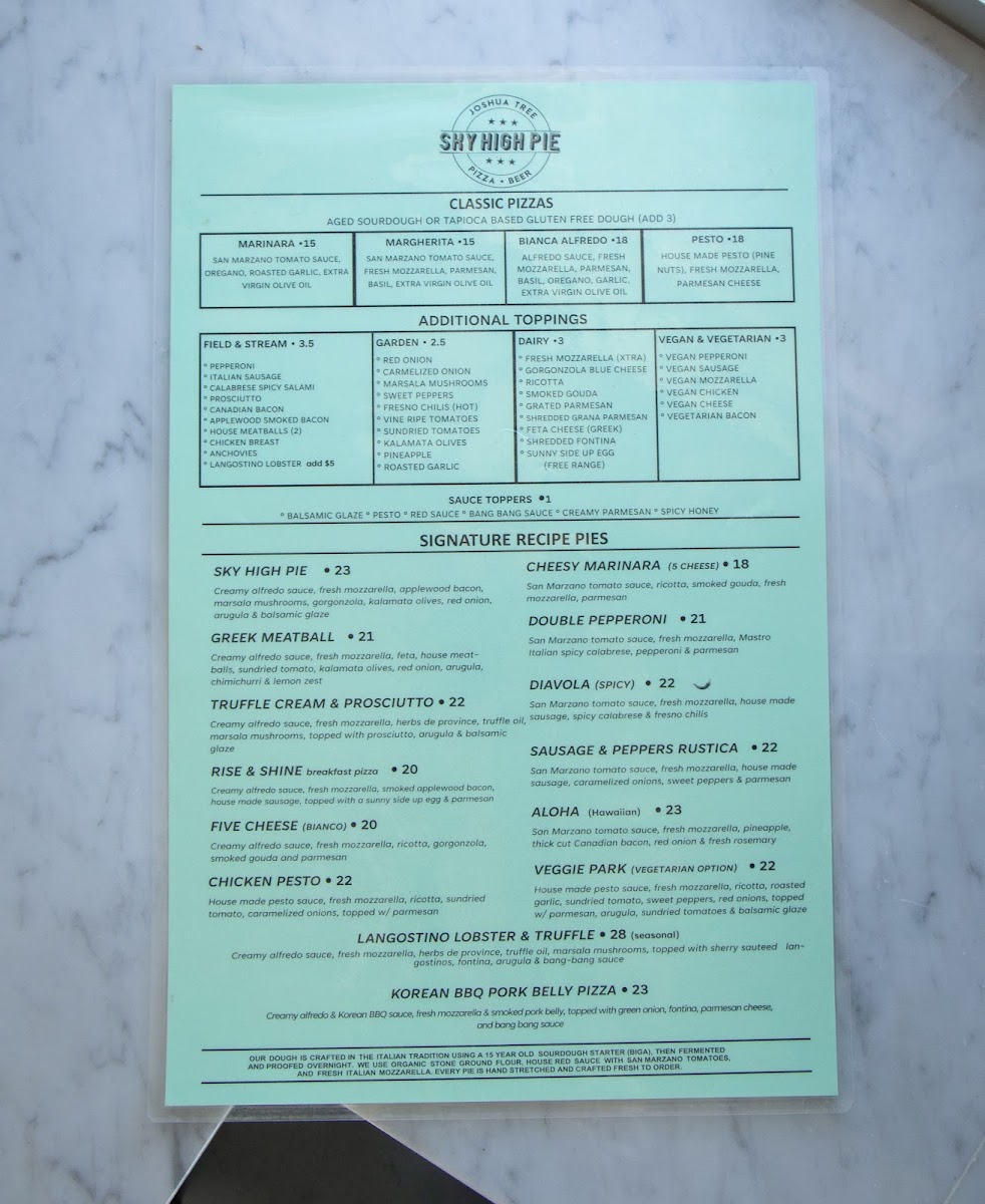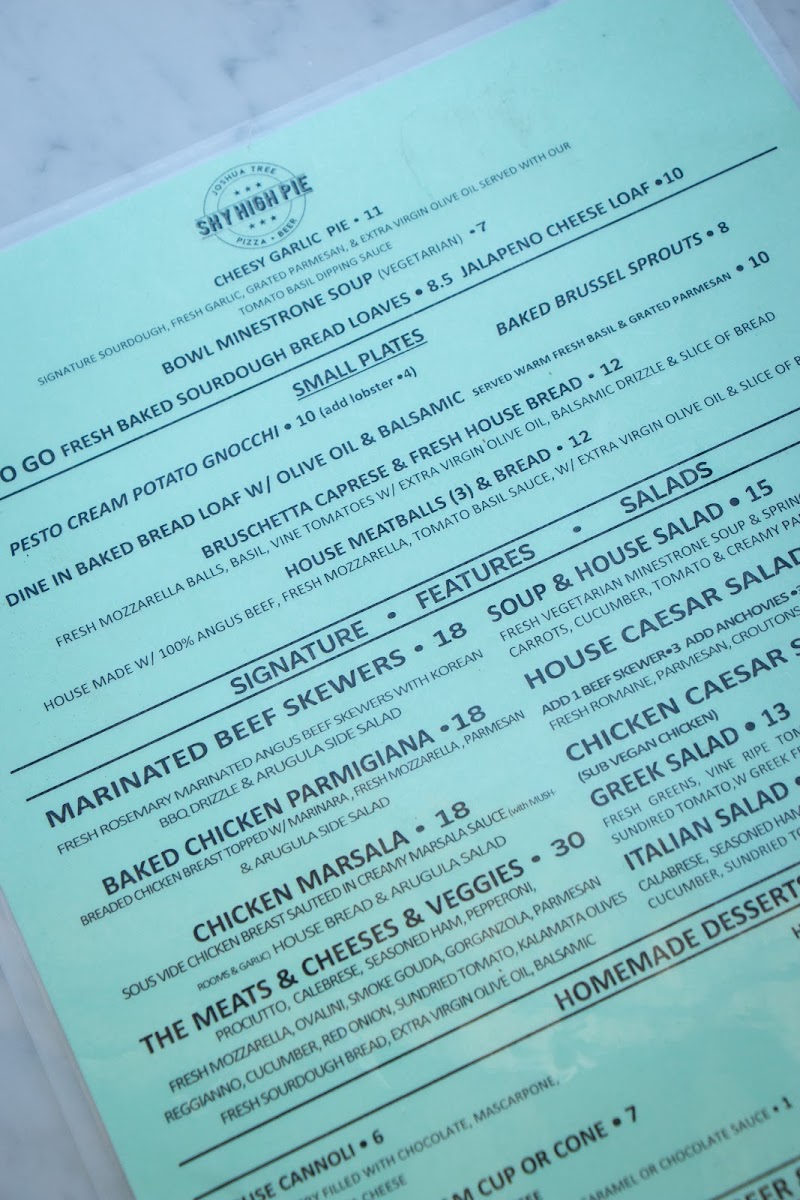 The menu at Sky High Pie offers a straightforward yet thoughtfully crafted selection that blends comforting pizza classics with unique, gourmet twists. It feels like a casual, friendly spot where you can enjoy hearty slices any time—from a relaxed lunch break to a laid-back dinner under the Joshua Tree sky.